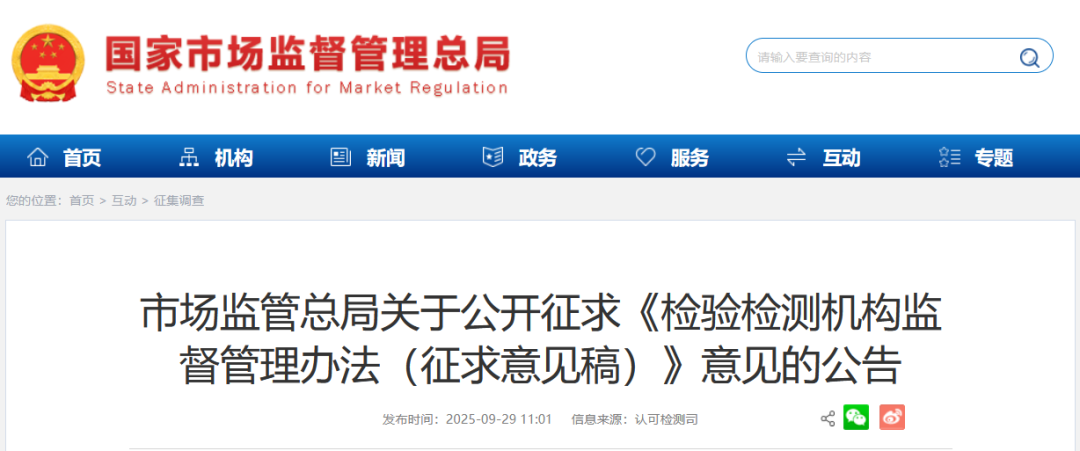 为深入贯彻落实党中央、国务院决策部署,进一步强化检验检测行业管理,规范检验检测市场秩序,促进行业持续健康发展,市场监管总局启动《检验检测机构监督管理办法》修订工作,组织起草了《检验检测机构监督管理办法(征求意见稿)》,现向社会公开征求意见。公众可通过以下途径和方式提出意见: 一、登录市场监管总局网站(网址:http://www.samr.gov.cn),通过首页“互动”栏目中的“征集调查”提出意见。 二、通过电子邮件将意见发送至:rkjcsjgc@samr.gov.cn。邮件主题请注明“检验检测机构监督管理办法公开征求意见”字样。 三、通过信函将意见邮寄至:北京市海淀区马甸东路9号,市场监管总局认可检测司(邮政编码100088)。信封上请注明“检验检测机构监督管理办法公开征求意见”字样。 意见反馈截止日期为2025年10月28日。